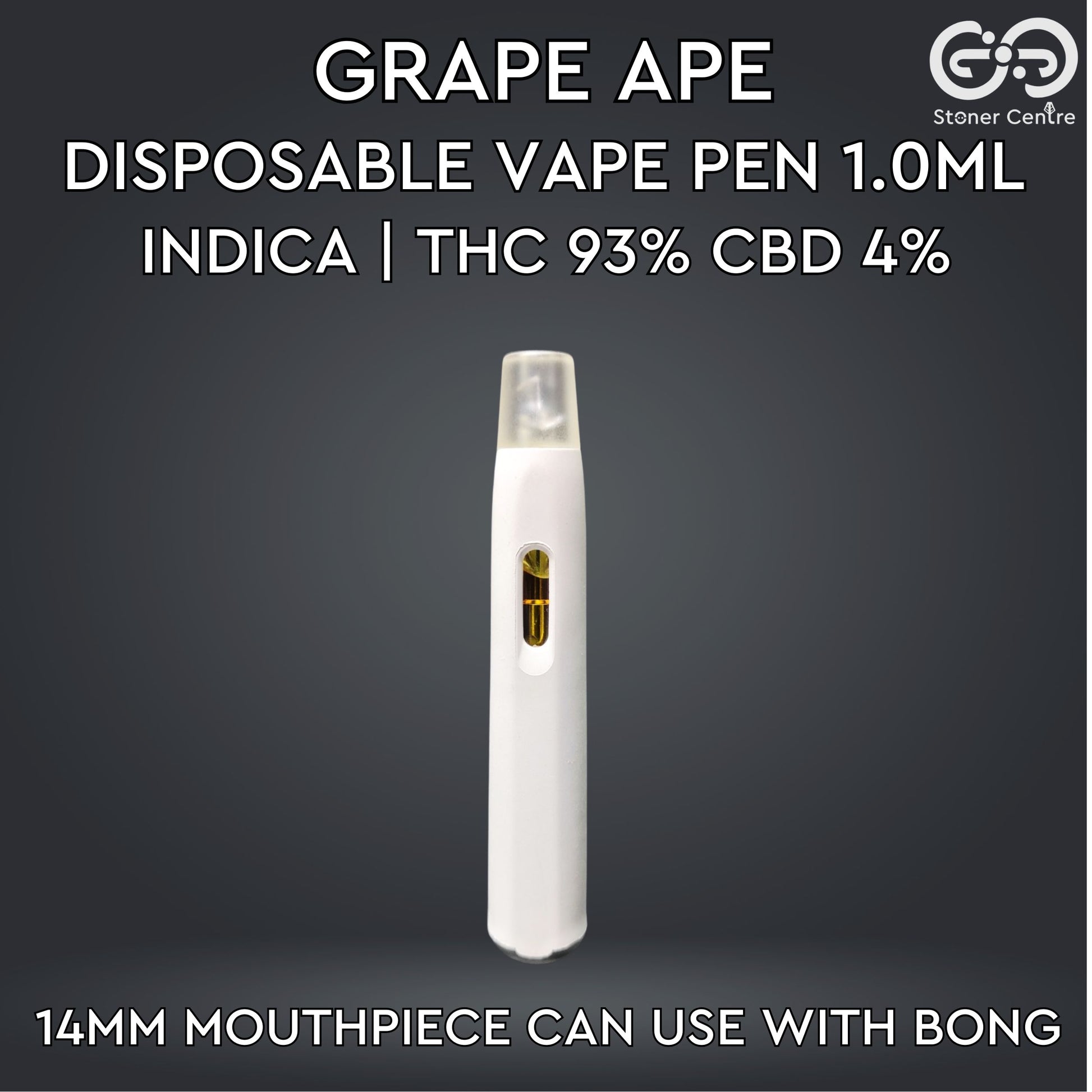 Indulge in the rich, sweet aroma of deep purple grapes with Grape Ape – a potent Indica strain that delivers true, full-body relaxation. Perfect for unwinding after a long day, this vape features 93% THC and 4% CBD, striking a calming balance while helping to ease stress and tension. Designed with a 14mm mouthpiece that connects to bongs, it offers a more versatile and immersive vaping experience.